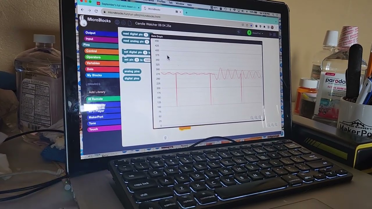 Roger Wagner initially did the activity with an infrared flame sensor but found that he obtained better results with a photoresistor: